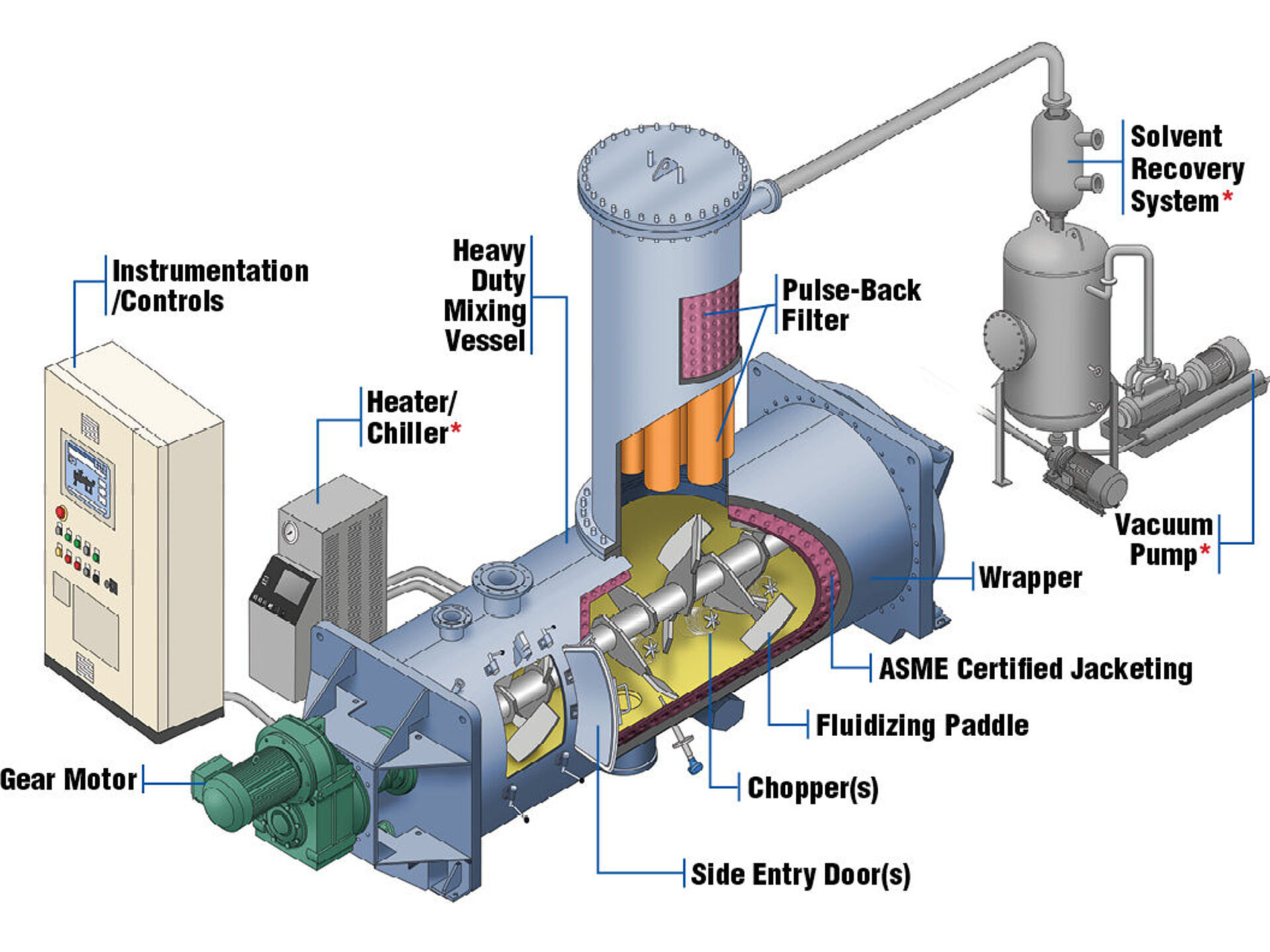Reacting, drying, vacuum drying, extracting, or sterilization (or combination thereof) can be achieved in a single vacuum/pressure capable vessel with ASME heating/cooling jacket, plow or paddle agitator and high-speed choppers.